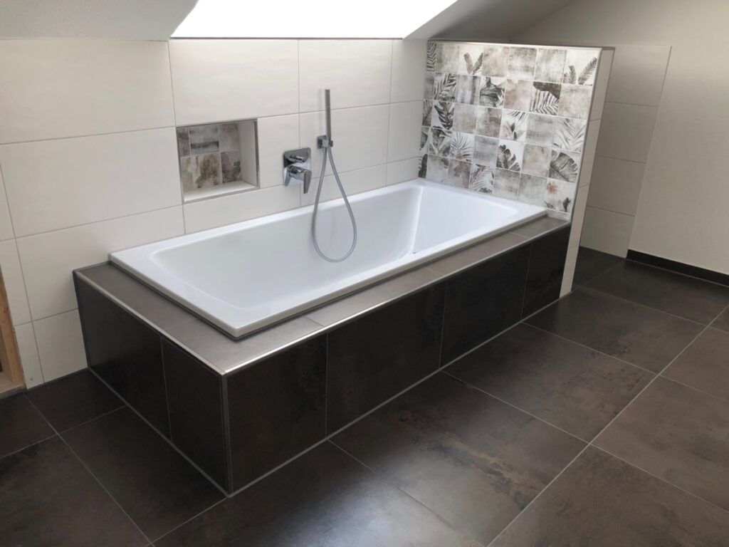 In der Gemeinde Ravensburg-Schmalegg ist ein modernes und großräumiges Badezimmer mit Badewanne und begehbarer Dusche entstanden.